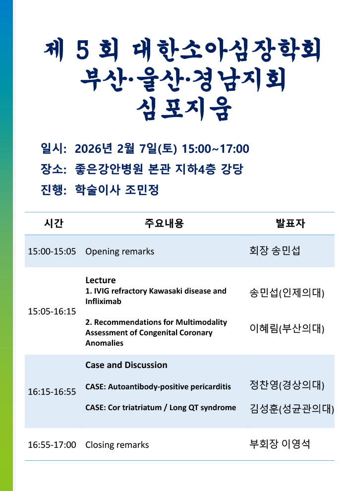 | 회원 여러분 안녕하십니까? 2026년 희망의 새해가 밝았습니다. 새해 복 많이 받으시고 회원님들의 가정과 건강에 행복 가득하시기 바랍니다. 병오년 높게 뛰어오르는 말처럼, 회원님들도 더욱 발돋움할 수 있는 한 해가 되기를 바랍니다. 제 5 회 심포지움은 부산·울산·경남 지역에서 소아청소년 및 선천성 심장질환을 공부하며 치료하시는 여러 선생님들을 모시고, 더 나은 치료를 위해 최신 지견과 경험을 나누는 시간이 될 것으로 생각됩니다. 환자 진료로 바쁘시겠지만 참석하시어 자리를 빛내주시면 감사하겠습니다. 일 시 : 2026년 2월 7일 (토) 오후 3:00 - 5:00 장 소 : 좋은 강안병원 본관 지하 4층 강당 ㅤㅤㅤ (부산광역시 수영구 수영로 493(남천동) Tel: 051-625-0900) 순 서 1. Symposium ㅤ - Opening remark (15:00 ~ 15:05) - 회장 송 민 섭 ㅤ - Lecture 1 (15:05 ~ 15:30) ㅤㅤIVIG refractory Kawasaki disease and Infliximab – 송 민 섭(해운대백병원 소아청소년과) ㅤ - Discussion (15:30 ~ 15:40) ㅤ - Lecture 2 (15:40 ~ 16:05) ㅤㅤRecommendations for Multimodality Assessment of Congenital Coronary Anomalies ㅤㅤ- 이 혜 림 (양산부산대병원 소아청소년과) ㅤ - Discussion (16:05 ~ 16:15) ㅤ - Case and discussion (16:15 ~ 16:55) - 회 원 ㅤㅤCASE :Autoantibody-positive pericarditis - 정 찬 영 (경상대병원) ㅤㅤCASE :Cor triatriatum / Long QT syndrome – 김 성 훈 (창원삼성병원) ㅤ - Closing remark (16:55 ~ 17:00) - 부회장 이 영 석 |