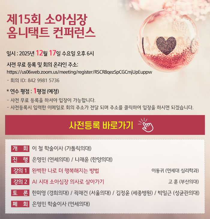 제15회 소아심장 옴니택트 컨퍼런스 일시: 2025년 12월 17일 수요일 오후 6시 사전 무료 등록 및 회의(온라인) 주소: https://us06web.zoom.us/meeting/register/RSCR8qezSpCGCmjUpEuppw 회의 ID: 842 9981 5736 * 연수 평점: 1평점 (예정) 사전등록(무료)을 하셔야 입장이 가능합니다. 사전등록 주소와 당일 입장하는 회의(온라인) 주소는 동일 합니다. 당일 시간에 맞추어 주소를 클릭하여 입장을 하시면 되겠습니다. |